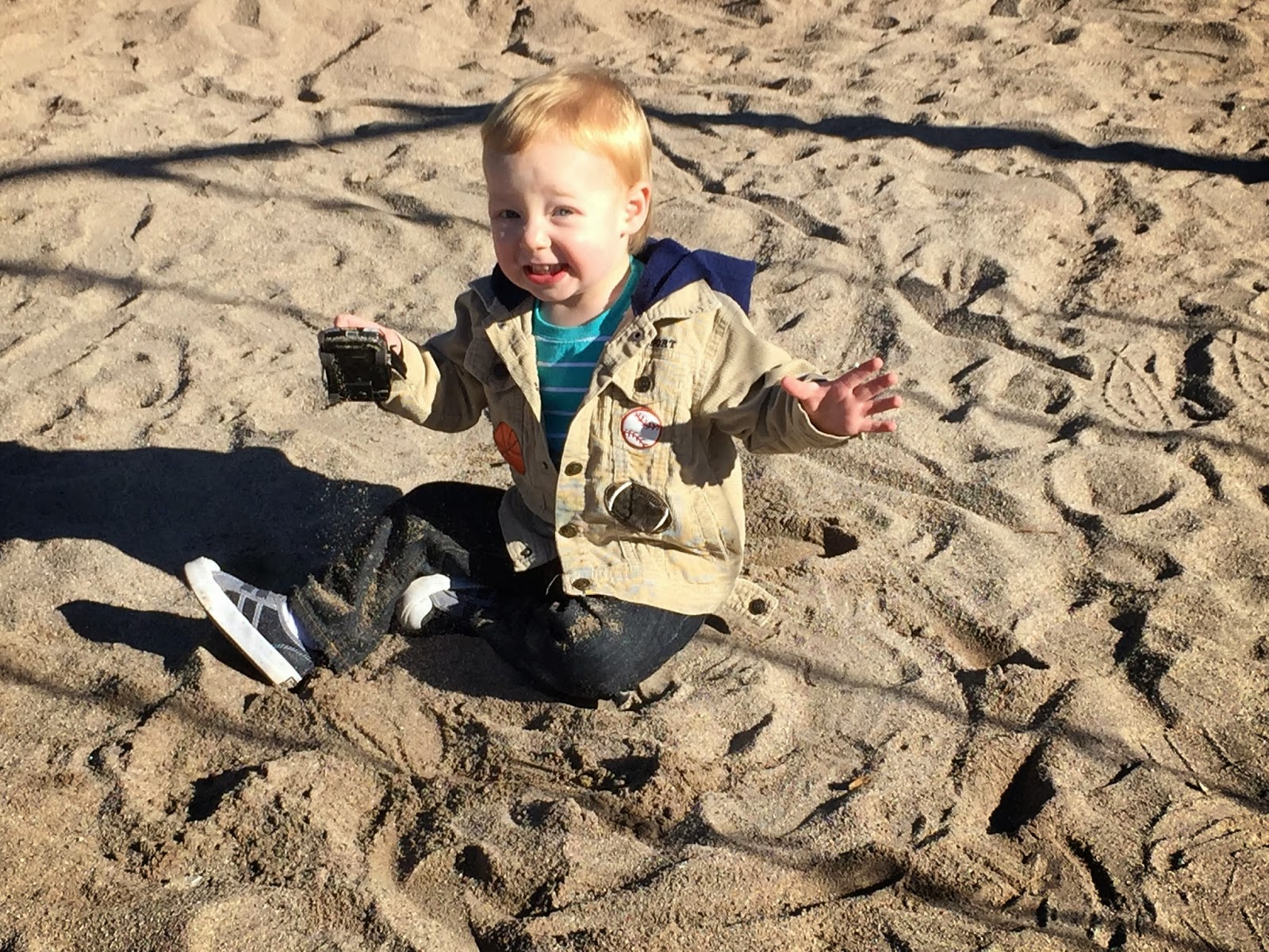 Since he couldn't ride the go carts he found happiness in playing with the drinking fountain
